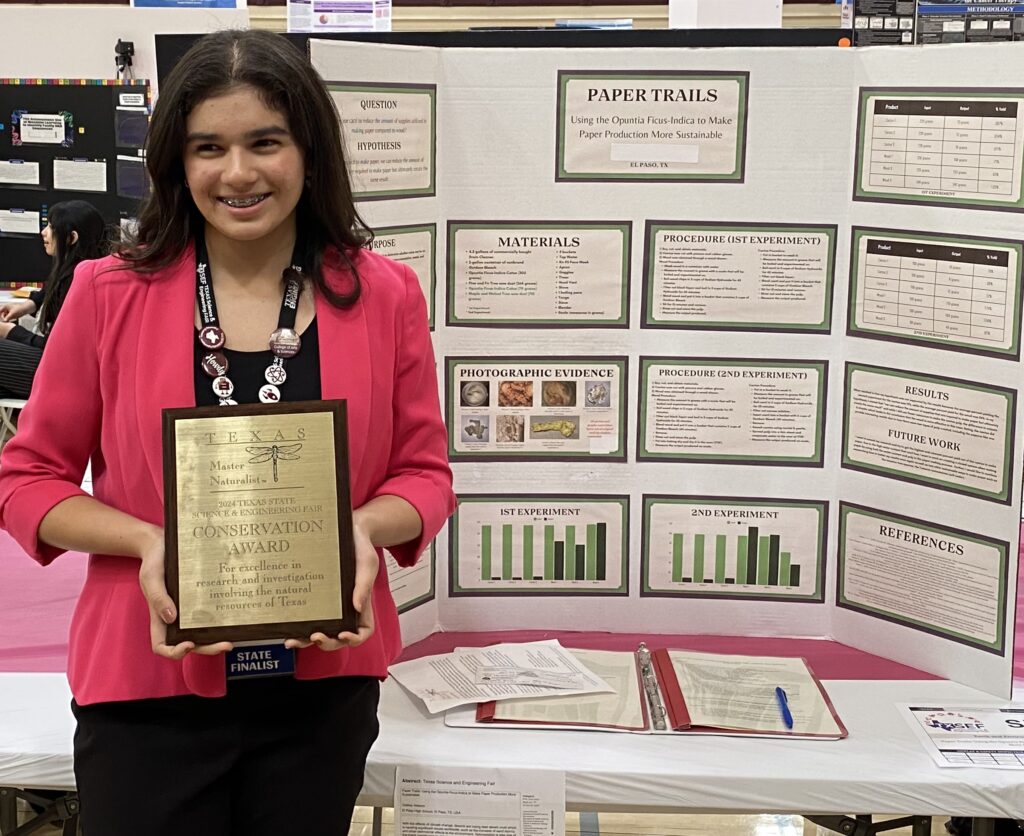 Galilea compared wood-based paper to prickly pear-based paper production in her “home lab”. She investigated ways to make the paper making process more sustainable with local natural resources. She demonstrated a passion for environmentally friendly methods of production.